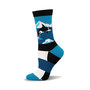 Orcas, also known as killer whales, are apex predators known for their intelligence and teamwork. Channel that same energy with these cozy socks that sport a striking blue and white striped pattern, complete with a majestic black orca whale. Made with a Merino wool blend, theyre not just eye-catching; theyre also super-soft, temperature-regulating, and comfy in every terrain. Say goodbye to frozen toes and hello to winter adventures!