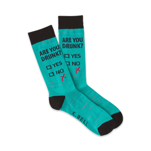 Test your levels of sobriety by simply checking off the correct box! Well, this certainly isn't going to plan. Show off your drunken sense of humor with these silly socks. Each cool pair of black and green crew socks features the question "Are you drunk?" with check boxes beneath it. We'd say the answer is yes!