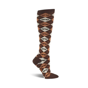 I mustache you a question. How do you feel about fancy argyle patterns? This pair of posh knee high socks will have you feeling quite dapper. Light and medium browns mix together with off-white for a classic yet natural flow of color. The traditional diamond pattern brings it all together. Fun eye-pleasing mustache prints are framed on the diamonds. You'll look simply fan-tache-tic wearing a pair!