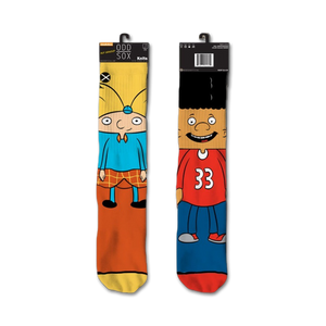 Get ready to team up with Arnold and Gerald with this vibrant pair of Hey Arnold! socks! These orange and blue socks are knit with a 360-degree design of the two best friends, ready to add a touch of Nick nostalgia to your feet. Whether you're reliving childhood memories or introducing your kids to the classic show, these socks will have you shouting, "Football Head!"