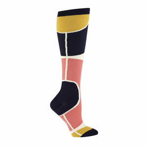 Is it futuristic? Is it retro? No, it's art deco! This flashy pair of knee high socks will have you feeling like you traveled back to the 1970's. Each pair features bold black, light gold, and pastel pink patterns with white lines breaking through the different shapes. These fun socks are retro, yet deco chic!