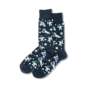 Blast off into your own orbit with these dark blue, space-themed crew socks. Featuring a cheerful pattern of cartoon astronauts in white and blue, these socks will make you feel like you're flying high among the stars. These socks are so fun, even Neil Armstrong would approve!