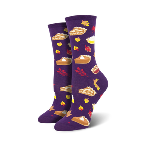 Don some Autumn Pies, purple-hued socks with a pattern of autumn leaves and pumpkin pies to bring a slice of pumpkin spice to your step. These crew length socks for women are perfect for pie enthusiasts and fashionistas alike. They're a sweet treat for your feet that'll make you the talk of the potluck.