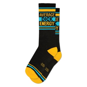 You know that vibe - not too much, not too little, just... there. These black crew socks capture that perfect balance with bold yellow text spelling out "AVERAGE DICK ENERGY" across the leg. They feature crisp yellow and bright blue stripes around the cuff and near the mid-foot, adding a pop of color to the dark background. The heel and toe sections are a vibrant yellow, rounding out the design. On the visible side of the foot, you can spot small, distinctive yellow geometric shapes, adding a subtle detail to this unapologetically direct pair.
