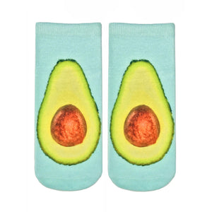 Brighten your feet with these ankle socks adorned with a playful pattern of green avocados with brown pits on a light blue background. Perfect for the food enthusiast, these fun socks add a dash of whimsy to any outfit.