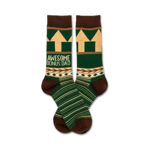 Calling all bonus dads! Looking to add an extra serving of awesomeness to your sock drawer? Say hello to the "Awesome Bonus Dad" crew socks! These socks boast a winning combo of dark brown at the top, vibrant green at the bottom, and a cool geometric design that's sure to make you the coolest dad in town. But the real star of the show is the message in white on the left sock: "Awesome Bonus Dad." These socks are like a big ol' pat on the back for all the hard work and love you pour into your family. Get ready to step out in style and show the world what a totally rad bonus dad you are!