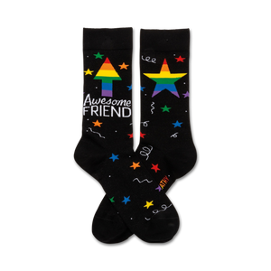 Featuring the words "Awesome Friend" with an arrow playfully pointing upwards, these socks are a tribute to those who light up our lives in vibrant rainbow hues. Perfect for those who know that true friendship isn't just about reaching for the stars—it’s about wearing them, too. Ideal for gifting or simply proclaiming your friend-status to the world, these socks are your everyday reminder that someone thinks you're universally fantastic.