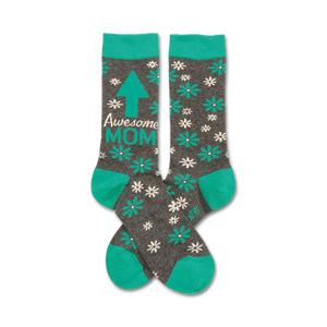 Get ready to walk the talk of awesomeness with our Awesome Mom Crew Socks! Splashed in shades of turquoise, gray, and white, these socks are a toe-tapping tribute to the amazing moms out there. Picture your feet doing a happy dance, wrapped up in a pattern of tiny white flowers, shouting out "Awesome Mom" with every step. Perfect for making any day feel like Mother's Day, these socks are a fun, cozy way to say, "Hey Mom, you rock!" No special occasion needed – just pure, foot-loving fun.
