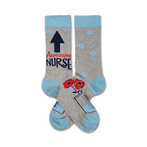 Nurse, you're Awesome! Rock these gray socks with red and blue details, featuring the word 'Awesome' pointing up to the word 'Nurse'. Perfect for those brave ladies taking care of our health! These comfy crew socks are meant to inspire.
