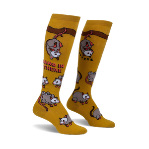 Okay, so these socks are a bright mustard yellow color, perfect for adding a pop to your outfit. They've got a bunch of opossums all over them - some are just chilling, and a few are hanging upside down from a brown branch that runs across the top part of the sock. You can see some of the opossums are carrying little babies on their backs, which is pretty cute. On one side, there's text that says "HANG IN THERE" in a white font with a red border, which ties into the hanging opossum theme. The opossums are mostly grey and white with pink details like noses and ears, and their long tails are visible too. They look pretty chill, just doing their thing on your feet. These socks are a fun way to remind yourself to keep going, with a little help from some very awesome opossums.