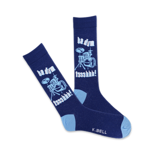 Put on a pair of Ba Dum Tssshhh socks today and make a statement with your feet. These men's socks feature a graphic of a drum kit on a dark blue background with a light blue toe, heel, and top cuff. The text "ba dum tssshhh!" is situated below the drum graphic and will definitely make you smile. The next time you need a reminder that life is full of rhythm, just look at your feet. It's a comical and playful way to add a touch of fun and energy to your day.