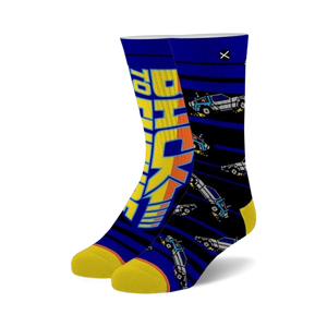 Blast back to the 80s with Marty McFly on these tub-ular crew socks! Guaranteed not to leave you hanging, these bad boys feature a sleek blue design with yellow stripes, toes, and heels, as well as a sweet set of wheels. The perfect addition to any fan's collection.