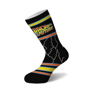 Blast back to the past with these Back to the Future socks that feature the iconic DeLorean DMC surrounded by lightning bolts. Inspired by the classic 80s movie trilogy, these socks will have you time-traveling in style.
