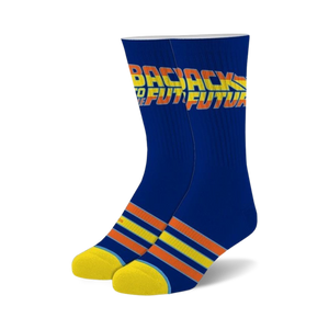 Blast to the past! Back To The Future Stripes Crew Socks take you straight to the Silver Screen in a blue time-traveling DeLorean with yellow trim, accented with red and orange stripes zooming up your legs. Whether you're McFlyin' to work or the Enchantment Under the Sea dance, Marty would be proud. Socks so tubular, you might even run into Einstein.
