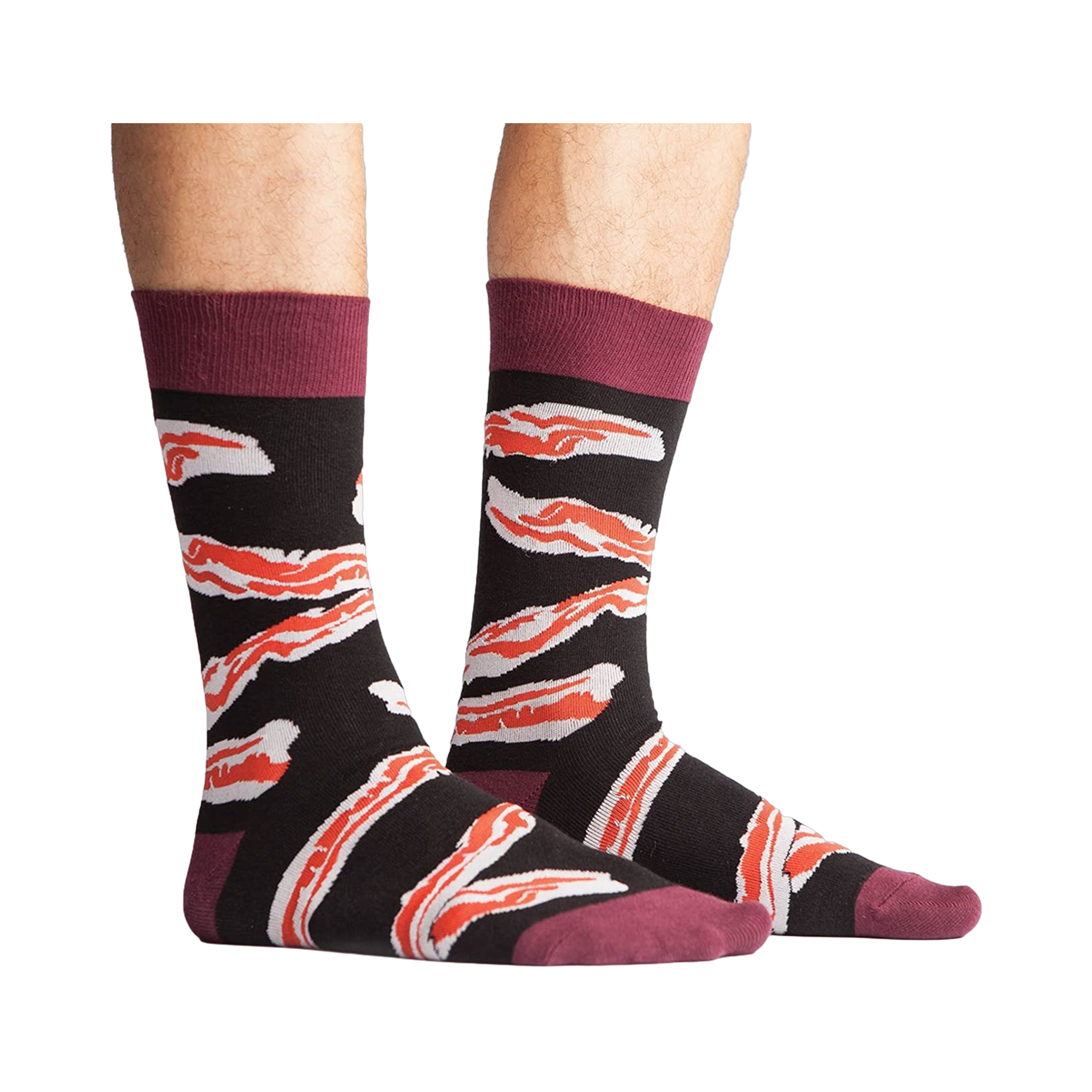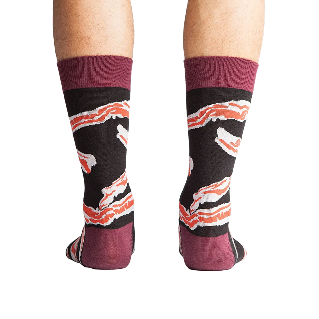 Bacon is like a national treasure to the taste buds. Goes great on sandwiches, subs, donuts, eggs, and even on socks! If you're looking for the perfect gift for your favorite foodie friend, these cool socks will not disappoint! This fun pair of bacon crew socks will show your commitment and love for this wondrous breakfast protein. Several strips of crispy goodness await your feet! Warning: These socks are not edible!