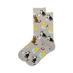Cloaked in the stealthy gray of a twilight prowler, these crew socks feature a gang of furry anarchists in black, white, orange, and tabby. Watch them enact their cunning plans—whether it's executing a perfect scratch maneuver, masterminding a mug-toppling heist, or embarking on a covert fishbowl mission. Perfect for those who admire the rebel spirit of our whiskered companions, these socks are your secret to walking on the wild side of comfort without ever causing a cat-astrophe. Embrace the chaos—quietly, cozily, catastrophically cat.