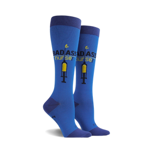 Pair of women's knee-high socks in blue.  The socks feature a graphic of a syringe and the text 'Badass Nurse!' in yellow and black. }}