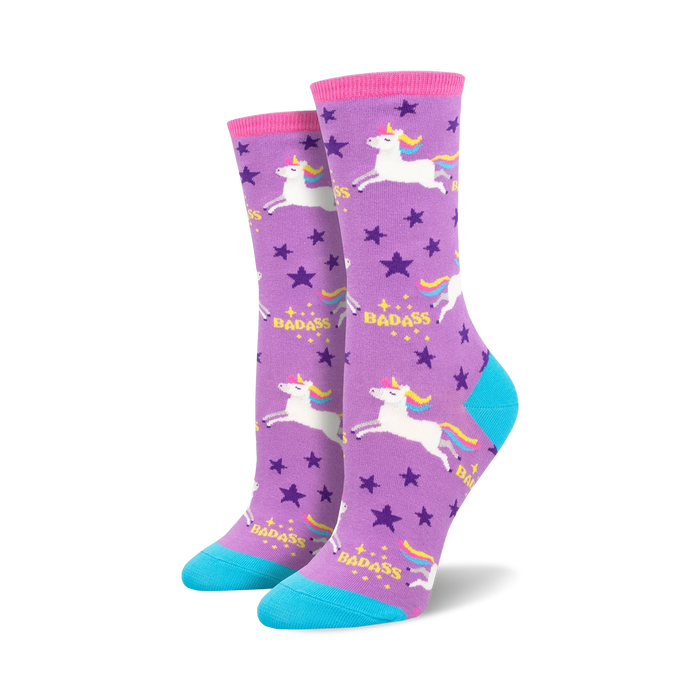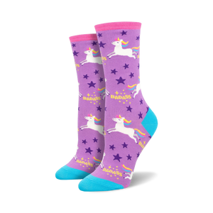 These purple crew socks aren't just a cozy cover for your toes; they're a declaration of your inner badassery—subtly stitched into every fiber. Adorned with playful unicorns and celestial bodies, these socks are perfect for days when you're feeling a little magical, a bit mischievous, or just downright daring. Go ahead, put on a pair and conquer the mundane with a spark of fantasy!