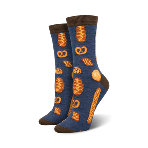 Our Bakery Themed Crew Socks offer a fresh batch of style, straight out of the fashion oven. Dressed in delightful shades of blue, these socks are peppered with scrumptious designs of croissants, pretzels, and bread in warm tones of orange and brown. Perfect for loafing around the house or kneading your way through a busy day, they’re a feast for your feet! Why settle for plain when you can go pane?