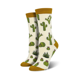 With these Bamboo King Cactus Crew Socks, you can bring the desert to your feet! Featuring various green cacti on a white background, these socks add a pop of color and a dash of fun to your day. Plus, the brown toe, heel, and top make them the perfect accessory for any cactus-lover.