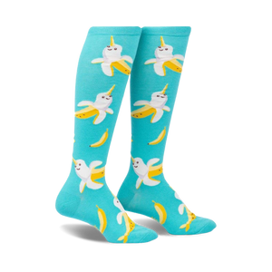 Kick boredom to the curb and embark on a wild sockventure with Bananarwhals! These striking knee-high socks dazzle with a parade of white narwhals, each boasting a bright yellow banana peel body and a magical horn. Slip into a pair of Bananarwhal socks and prepare for an odyssey where imagination reigns supreme, transforming ordinary steps into a fantastical journey of mythical creatures and endless smiles.