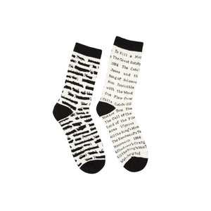 Banned Books: Walk with literary defiance in these crew socks featuring titles of banned books in bold white print on a black background. A quirky and thought-provoking accessory for bibliophiles and free speech advocates, these socks make a statement wherever you go. Show your support for the freedom to read and celebrate the power of words.