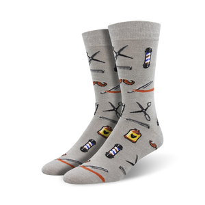 These bad boys feature a black and white scissor, Brown and black razors, orange and black combs, and sky blue and white barber poles on a gray background. Their design evokes a nostalgic feel of classic barber shop styling. Barber Shop Bamboo, a Mens Crew Sock, is perfect for showing off your unique fashion sense with the liveliness of a barber shop.