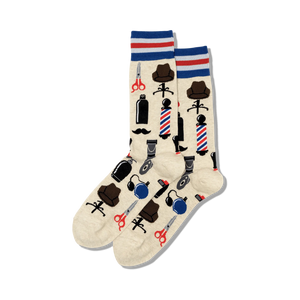 Barber Shop socks - Get your hair and socks game on point with our Barber Shop Crew Socks. Featuring a rad pattern of blue & red barber poles, black scissors, gray hats, and brown shaving cream bottles on a patriotic red, white, and blue striped top - these socks will make you the sharpest dressed dude in town. Whether you're a barber by trade or just a follicle enthusiast, these socks are sure to bring a smile to your face and some style to your feet.