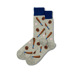 These gray crew socks are an absolute grand slam for baseball fans! The pattern features brown baseball bats crossed over each other as well as catchers mitts in between the bats. You'll hit a home run with these socks on the next game day or practice. Just make sure you don't get picked off!