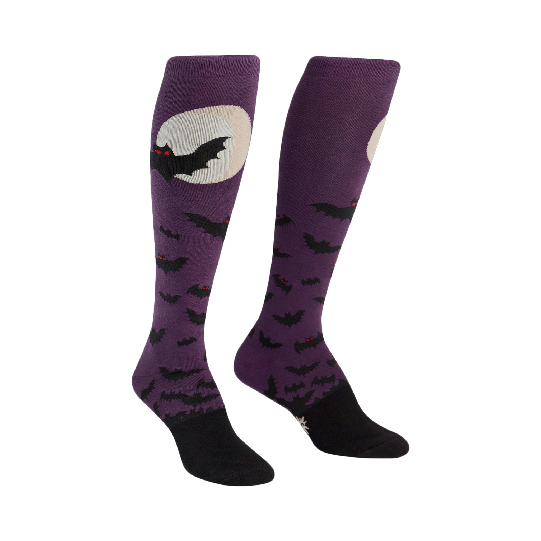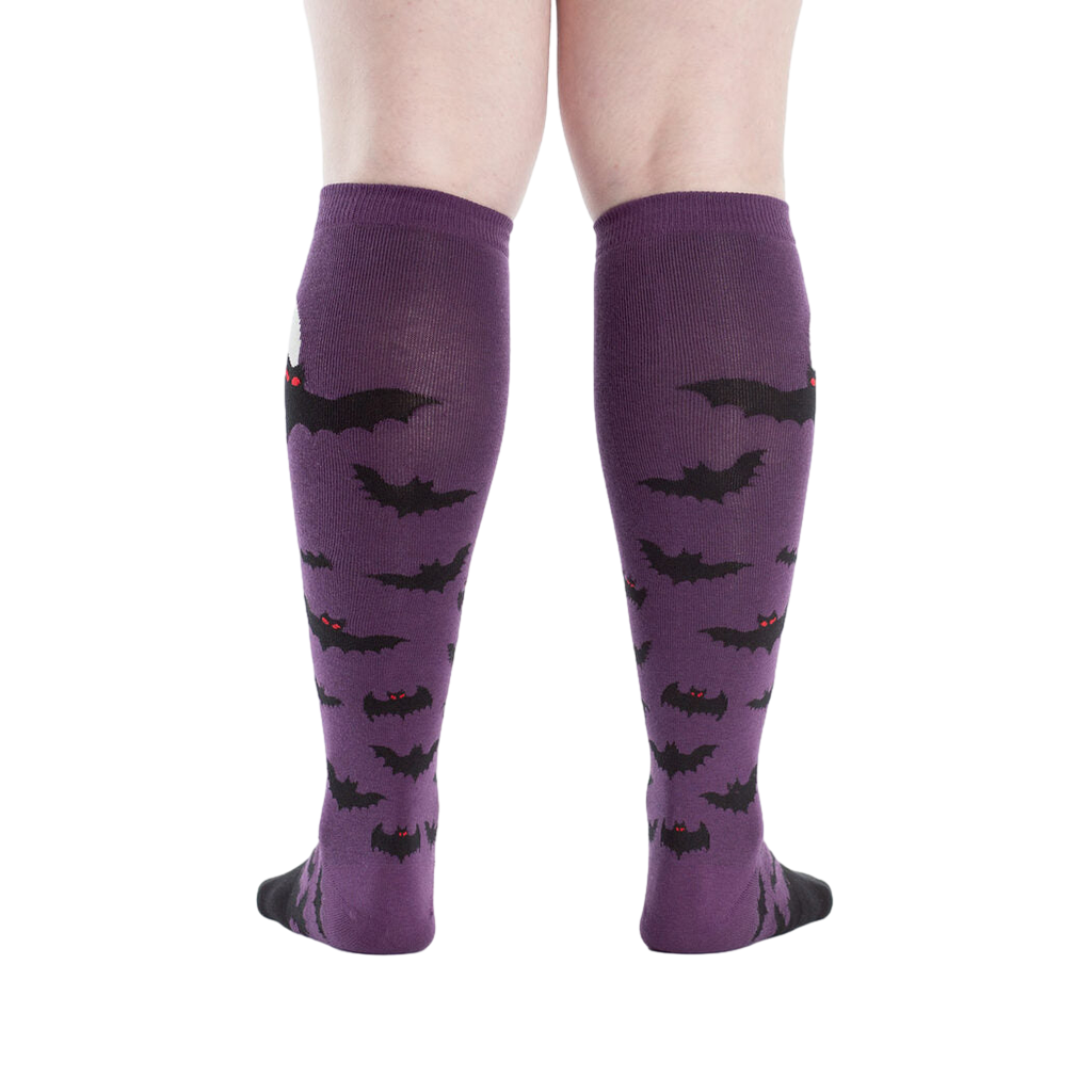 Meet the Batnado: knee-high socks that'll have you soaring. They're a deep purple with a flock of bats swirling around a full moon. One bat is shown prominently flying near the moon. The visible parts of the socks have a black toe and cuff. And get this- they glow in the dark! So yeah, pretty awesome.