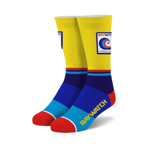 Step into the iconic world of Baywatch with these fun and vibrant socks. A touch of retro fun for fans of the iconic 90's TV show, with the easily recognizable stripe, toe design, lifeguard patch and bold embroidered logo. A perfect way to add a splash of color to your everyday wardrobe and show off your love for the beach.