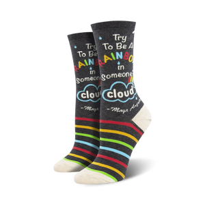 Be A Rainbow socks: strut your style with these fun literary quote socks and brighten up your wardrobe with a dash of black and white. Show off the bold words 'Try To Be A Rainbow In Someone's Cloud' by Maya Angelou and inspire those around you. These socks have a colorful cloud design with a hopeful rainbow, reminding you to be a beacon of light even on cloudy days.