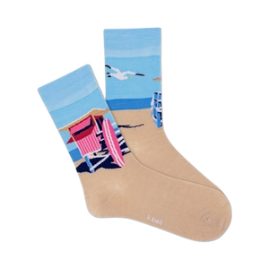 Beach Hut socks are just what you need to bring the boardwalk to your feet! These blue, tan, and pink socks feature a pattern of beach huts, palm trees, and seagulls. The cheerful colors and playful design are sure to turn you into the day's most popular lifeguard!