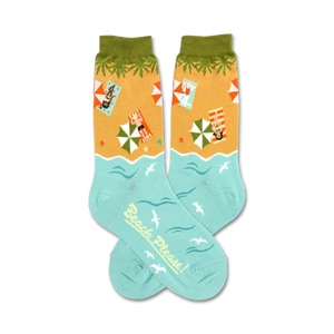 Beach, please! These women's crew socks are the perfect way to say you're ready for summer. With a pattern of "Beach Please" written on a blue background with white seagulls, women in swimsuits, palm trees, and beach umbrellas, these socks are sure to turn heads. So kick back, relax, and let the good vibes flow.