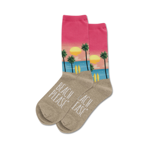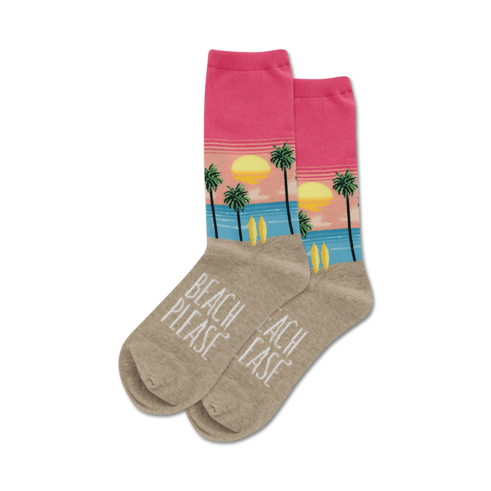 Dig your toes into a pair of our funky Beach Please socks and let your feet soak up the sunset. Summer vibes never go out of style, and with these crew-length socks, who cares what day it is? The bright, colorful palm tree design will make you feel like you're sipping a drink on the beach, even if you're just stuck in the office. Plus, the words "BEACH PLEASE" let everyone know that you're not afraid to show off your fun side.