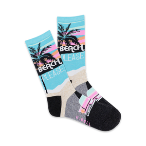 Beach Please! These socks scream summer vibes with their bright colors and fun design featuring pink palm trees, a pink car, a beach, and the words "BEACH PLEASE" in big, bold letters on a bright blue background. You'll feel like you're on vacation every time you wear them. Plus, the black toes add a touch of sophistication.