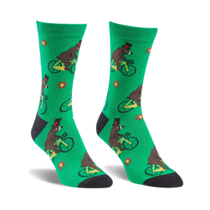 Are we there yet? I swear, we have "bearly" gotten anywhere! Whether you are a fan of the circus, "beary" bad puns or just bears in general, owning these fun socks are a must. You'll be beary glad you got these socks to compliment your shoes! Each pair of awesome green crew socks has a fun pattern of bears in hats riding bicycles.