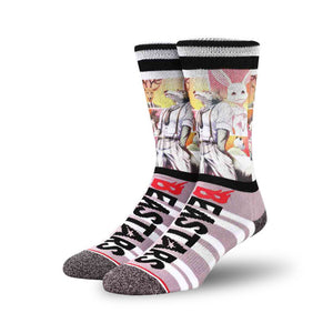 Beastars Character Crew Socks: step into the world of your favorite anime, Beastars! These white socks feature vibrant sublimated prints of characters from the show, set against a grey and white striped pattern. Show off your love for the series and add a touch of whimsy to your everyday wear. Whether you're a fan of Legoshi, Haru, Louis, or any of the other characters, these socks are sure to make you smile. Put on a pair and let the adventure begin!