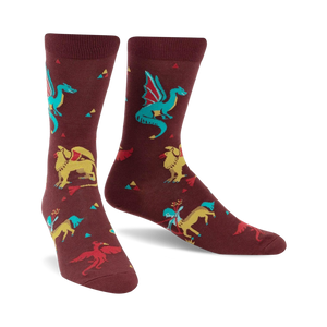 Beasts of Yore socks will transport you to a magical realm where dragons, griffins, and unicorns roam free. These mythical creatures in vibrant hues dance across a backdrop of geometric shapes, making these socks a whimsical fashion statement. Experience a touch of fantasy with every step!