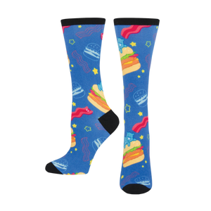 Fans of Bedtime Bear, one of the OG Carebears from the 80s, will love these cool socks.Bedtime Bear will have you dreaming of the munchies in no time. Bacon and hamburgers are definitely notable things to dream about! Each fun pair feature Bedtime Bear dozing off on a hamburger with bacon strips swirling around. These women's novelty crew socks come in a pleasant shade of blue with attractive black cuffs, heels, and toe lines.