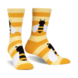 Ever notice how bees seem to have it all figured out? Constantly buzzing with purpose and yet perfectly content in their hive. Our Bee Cozy Slipper Socks capture that essence, transforming your feet into a realm of relaxation and warmth. With every step, feel the gentle caress reminiscent of a bustling bee colony, ensuring your toes are snug and happy. Its a world where comfort meets whimsy, wrapped up in vibrant yellow and white stripes and adorned with charming black bees.