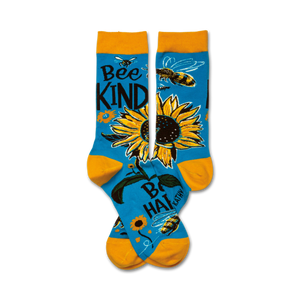 Get your foot in the door of fashion with these Bee Kind socks. Featuring bright yellow sunflowers with the words "Bee Kind...Bee Happy" these socks will surely put a smile on your face and brighten your day. Wear these inspirational socks to remind yourself and others to bee kind and make the world a happier place.