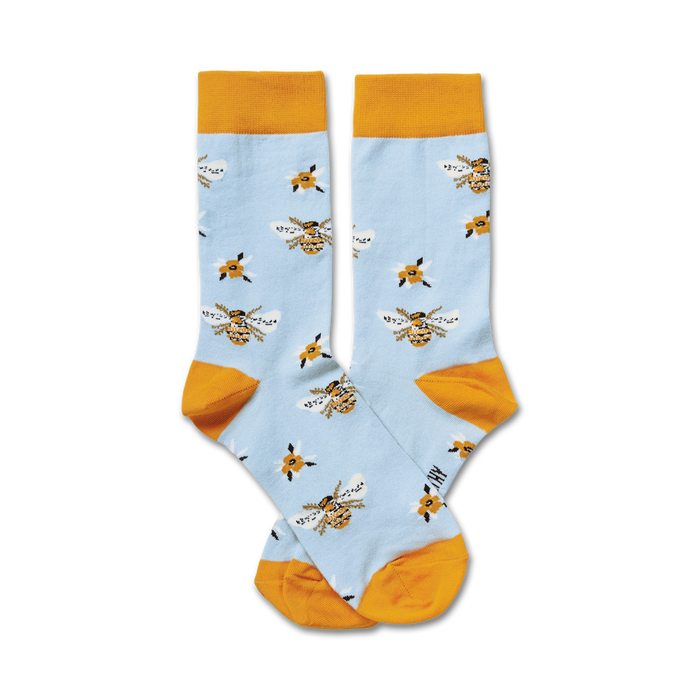 Buzz into the world of incredible socks with our "Bee" collection! These crew length socks for women feature a delightful pattern of bees and four-petal flowers against a vibrant light blue background, with a cheerful orange cuff. Slip on a pair of these socks and let the buzzing bees remind you to appreciate the sweet things in life, like honey and cupcakes and blooming flowers! These socks also make a perfect gift for any bee lover or fan of puns.