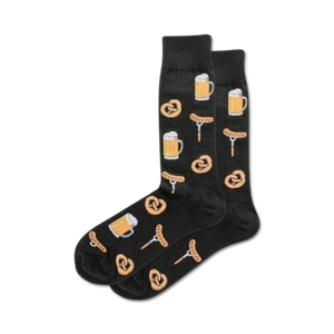 Raise a pint to your new favorite foot-cover: Beer and Pretzel socks! These black crew socks are covered in a frothy pattern of beer mugs, sausages, and pretzels, because you deserve a cold one in your closet too. So put on a pair and let the good times flow. Your feet will feel like they're at Oktoberfest!