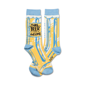 Beer Awesome socks are the ultimate party favor for any beer lover. With their bright yellow color, blue toe, heel, and cuff, and the words "This Beer is Making Me Awesome" printed on the front, these socks are sure to get a laugh from your friends. Plus, they're made with a cushioned sole for all-day comfort, no matter if you're sipping suds at a backyard BBQ or hitting the dance floor at your favorite bar. Who knows, they might even help you make some new friends!