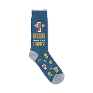 Raise a pint to the Beer Makes Me Hoppy socks! These beer lover's socks feature yellow pixelated beer glasses, hop cones, and the phrase "Beer Makes Me Hoppy" in bold yellow text. These fun and durable cotton socks are the perfect gift for the craft beer enthusiast in your life. Wear a pair the next time you pop open a brew!