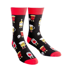 Gather your best beer pong crew and hit the tables, you're in for a not so sober night! This fun pair of black and red crew socks have smiling cups, balls, beer glasses, beer bottles, and kegs printed all over. You'll feel like you're in college all over again… Or wake up hungover the next morning realizing you still are!
