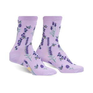 Check out our Bees and Lavender socks! These purple crew socks are covered in an adorable pattern of black and yellow bees buzzing around dark purple lavender flowers with light purple and yellow centers. They're 100% buzzworthy!