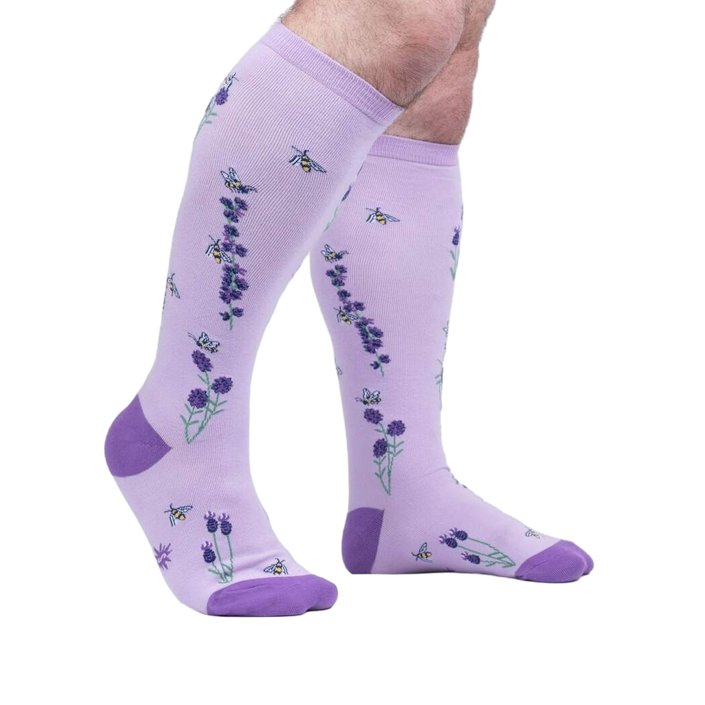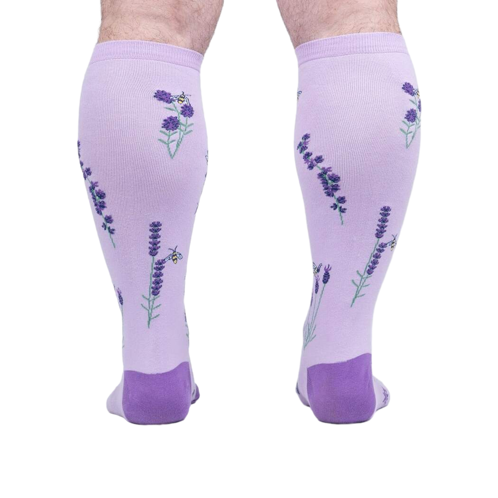 Purple knee-high socks with bees and lavender flowers are a buzzing choice for any woman's wardrobe. These knee high wonders will turn those boring legs into springtime meadows in bloom with every step you take. Try not to get honey on your shoes though.