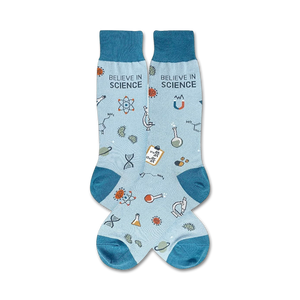 Blast off into the stratosphere of style with these 'Believe In Science' socks that scream smart casual from your toes up! These crew socks for men are adorned with an array of scientific symbols, equations, and the bold statement "Believe in Science" on top, making a cosmic fashion statement. Put on a pair of these socks and let your feet do the talking, advocating for the beauty of scientific exploration!